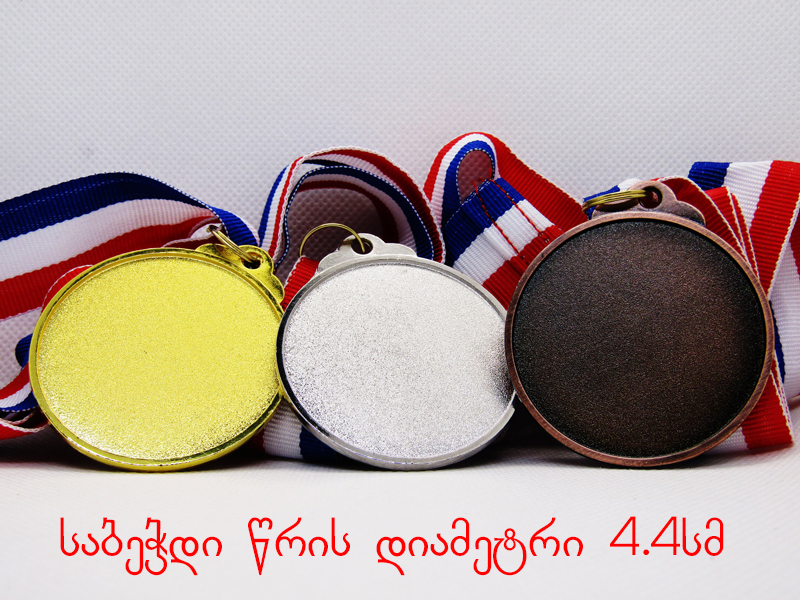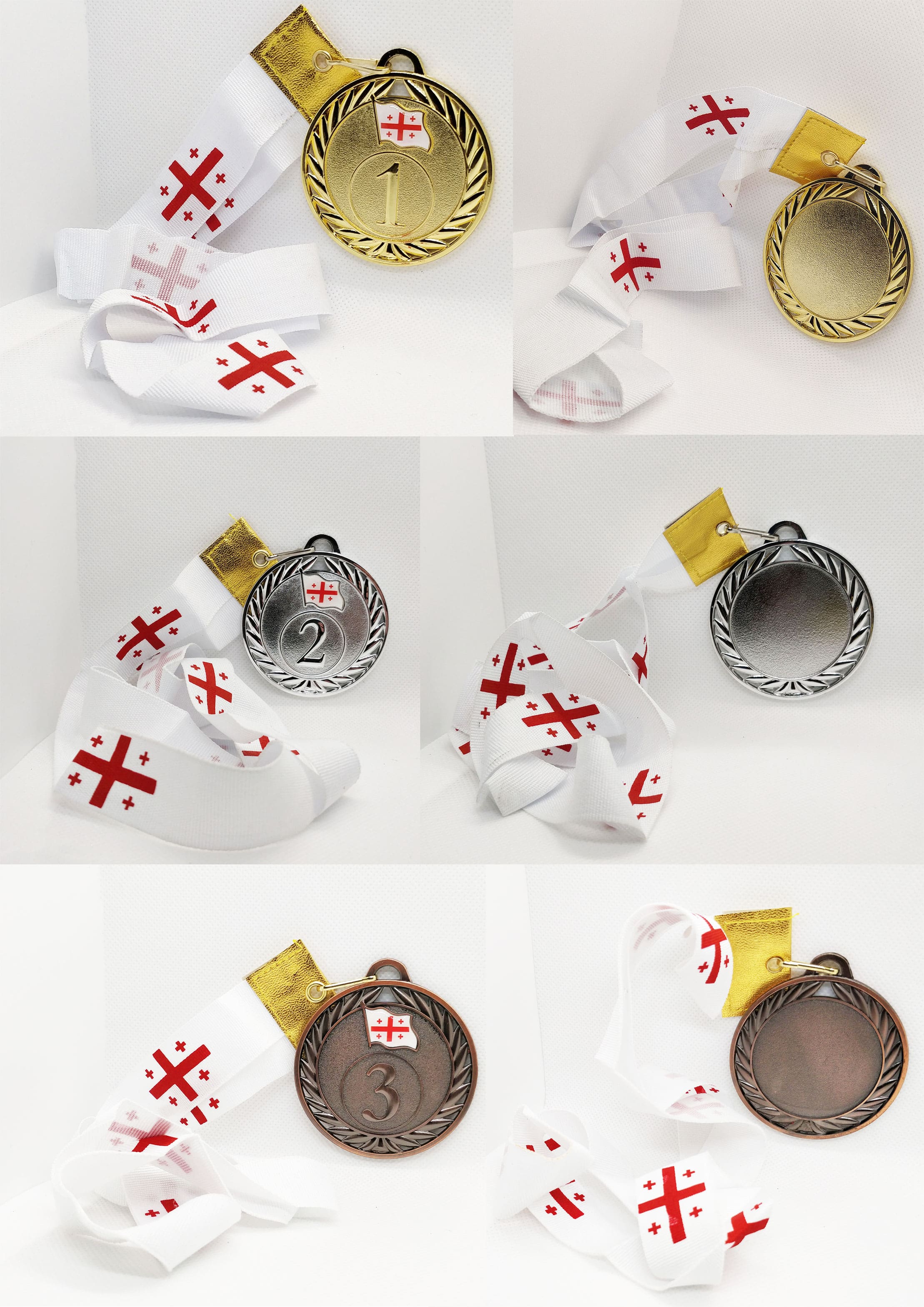 | მედლები "ოქრო" - "ვერცხლი" - "ბრინჯაო" ცენრში მოთავსდება თქვენთვის სასურველი ნებისმიერი სირთულის შავ-თეთრი ანდა ფერადი გრაფიკული გამოსახულება, რომელიც იბეჭდება მეტალის ფირფიტაზე. საბეჭდი წრის დიამეტრი - 4.4სმ მედლის დიამეტრი - 4.9სმ |